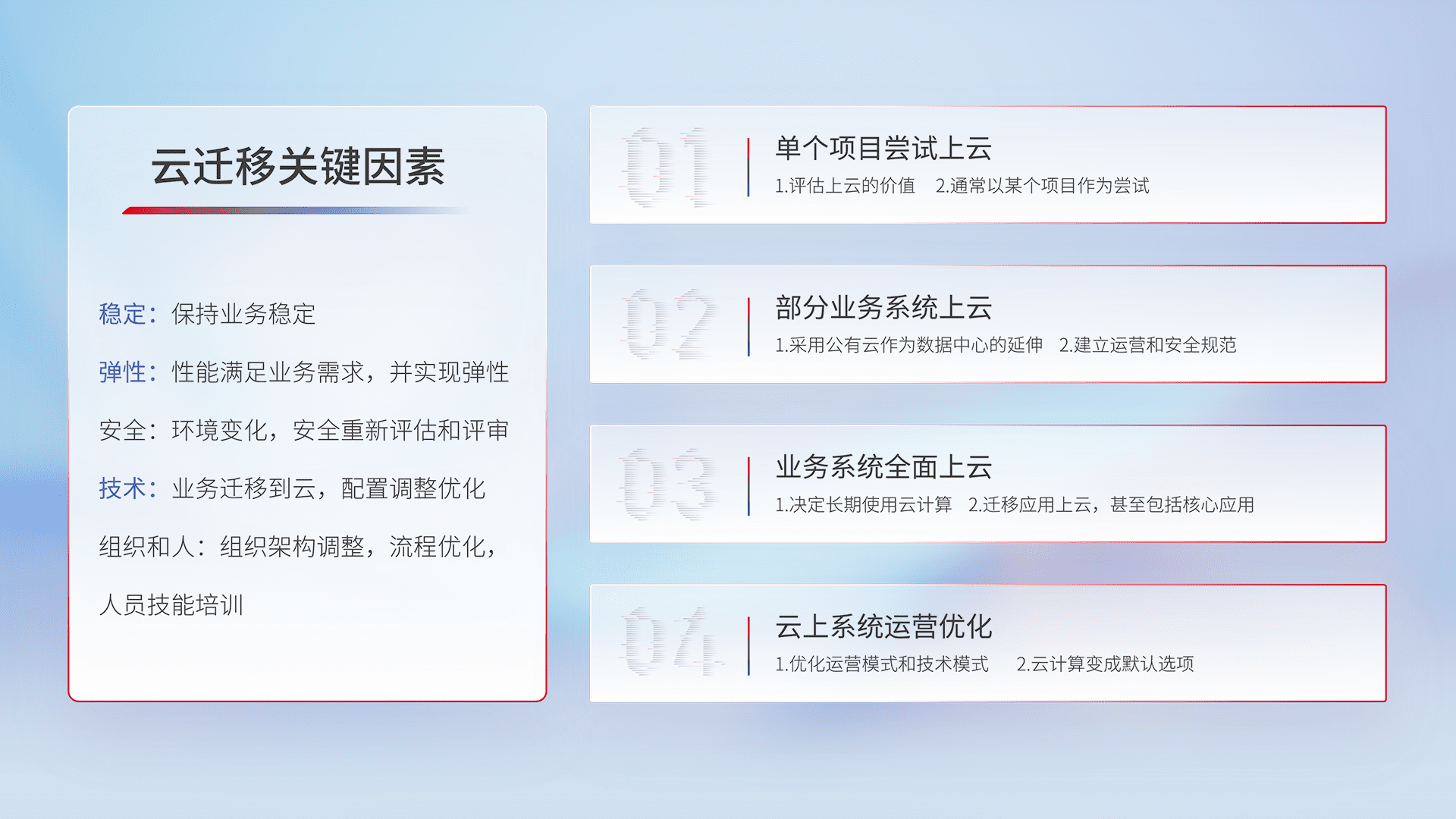 结合实际业务,,,从规划设计、、、云平台选型、、、、云原生改造、、、、数据迁移、、集成交付,,迁移全过程为客户识别最佳上云路径,,,做好风险识别管理,,,,设计网络架构、、身份权限、、安全审计合规、、、操作审计、、日志审计、、、、监控告警策略、、、、多站点容灾设计等,,,对云上基础设施进行整体规划,,,,提升IT治理水平,,以满足弹性、、、高可用、、、、高性能的需求。。。。